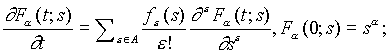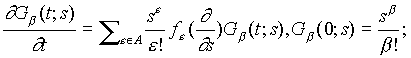 где Xt, Yt - некоторые взаимосвязанные случайные процессы (Fi(t; s) = åj=0 ¥ Pij(t) sj); вспомогательная производящая функция j(x, y; s) удовлетворяет нелинейному уравнению в частных производных первого порядка
